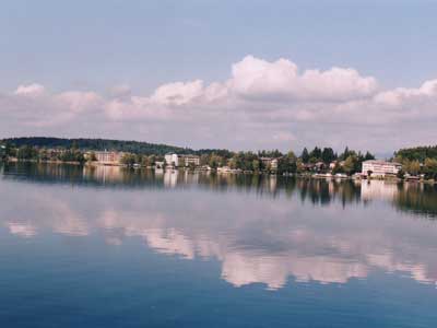 Im tiefsten Kärnten fast schon an der Grenze zu Italien und der Slovakei liegt er nun, der wärmste Badesee Europas. Nicht sehr gross aber doch einige Meter tief überrascht das Wasser auch im September noch mit angenehmen Badetemperaturen. Selbst Anfang Oktober kann man noch ein Bad riskieren - mit ein wenig Glück beträgt die Temperatur dann immer noch fast 18 Grad... Das Hotel: Amerika-Holzer am See Das Hotel liegt etwas ausserhalb des eigentlichen Ortes St. Kanzian / Klopein abseits der Hauptdurchgangs-Strasse und direkt am See (eigener Privatstrand). Zu Fuss kann man aber in ein paar Minuten an den anderen Hotels und Gasthäusern vorbei ins Zentrum gelangen. Gerade an lauen Sommer- oder Herbstabenden ein sehr angenehmer Spaziergang. Das Hotel selber ist mit 4 Sternen ausgezeichnet, aber schon ein wenig in die Jahre gekommen. Dies gilt insbesondere dann, wenn man im Haupthaus wohnt und nicht im vor einigen Jahren angebauten Erweiterungstrakt. Selbstverständlich findet man hier die normalen Angebote wie Sauna, Schwimmingpool (für die kalte Jahreszeit), etc. Das Personal - insbesondere im Restaurant - ist sehr freundlich und zuvorkommend, was man von den Eigentümern leider nicht immer sagen kann. So mussten wir fast einen ganzen Tag trotz mehrmaliger Nachfrage auf die Hotelmappe und die Beschreibungen der Annehmlichkeiten warten. Da wir gegen Ende der Saison angereist waren konnte nicht einmal die gerne verwendete Ausreder der Überlastung herhalten: Mit uns waren maximal 10 andere Paare im Hotel...! Wenn man allerdings Stammgast im Hotel sein sollte, so sieht die ganze Sache dann schon wesentlich anders aus - hier liefen auch die Besitzer zu Höchstform auf... Klar, die eigentliche Attraktion in dieser Gegend ist natürlich der See. Hier gilt es die Tage zu nutzen und sich mal wieder richtig zu entspannen. Der Ort selber bietet eigentlich auch alles, was der Normalurlauber benötigt: Lauschige Restaurant und Bar's (wenn's denn mal nicht Halbpension im Hotel sein soll... - übrigens sehr zu empfehlen, die österreichische Küche ist ziemlich gut und im Hotel bekommt man nicht immer das Beste...), Diskotheken, Bierbars und, und, und... Aufgrund der Tatsache, dass die Gegend um den See herum sehr flach ist, eignet sich die Gegend auch hervoragend zum Radfahren und Rollerbladen - auch für Anfänger! Es gibt kaum Gefällstrecken im Umkreis und so kann man in aller Ruhe den See umrunden Zur Abwechselung sporgen in der Gegend natürlich die Berge, die sich rings um das flache Seengebiet verstreuen. Daneben sind die folgenden Orte / Gebiete noch erwähneswert Graz Die Hauptstadt der Steiermark ist von Klopein über die Südautobahn relativ schnell erreicht und bietet allen, die es vermisst haben, die Angenehmlichkeiten einer grösseren Stadt: Restaurants, Geschäfte, Museen und was das Herz sonst noch so begehrt. Klagenfurt Klagenfürt in Kärnten ist die nächst grössere Stadt vom See aus gesehen. Im Gegensatz zu Graz geht es hier aber noch sehr ruhig und beschaulich zu . Sehr empfehlenswert ist hier die Innenstadt mit Ihren alten noch erhaltenen Bauten und den wunderschönen Parkanlagen. Wörther See Direkt an Klagenfurt angrenzend liegt der Wörther See mit dem Touristenort Velden und dem ebenfalls sehr bekannten aber nicht ganz so überlaufenen Pörtschach.